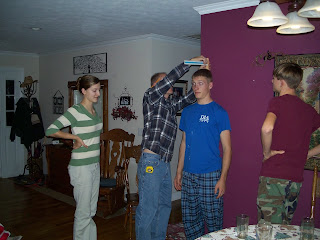We celebrated the kids birthday on Tuesday. My, how fast they grow up from wee little ones to young adults. Life is ever changing and I can barely keep up with the pace most days. I find myself wistfully thinking of when they were small. One of our birthday traditions is to measure the kids and see how much they have grown in a year. This used to be done on the back of a bedroom door in our 100 year old farm house, but we moved. No worries though, one of the last things we did before moving was to transfer all those marks (years) to a four sided stick that has a child's name on each side. So now you could say we are portable. We are a tall family and it looks like next year our one son might top the stick.....actually after next year (since they will be 18) I'm not sure we will be continuing. The kids were having some fun with this pretending to stretch Ian out before he was measured. Poppa had to get on a chair to mark the stick. He is one tall boy.